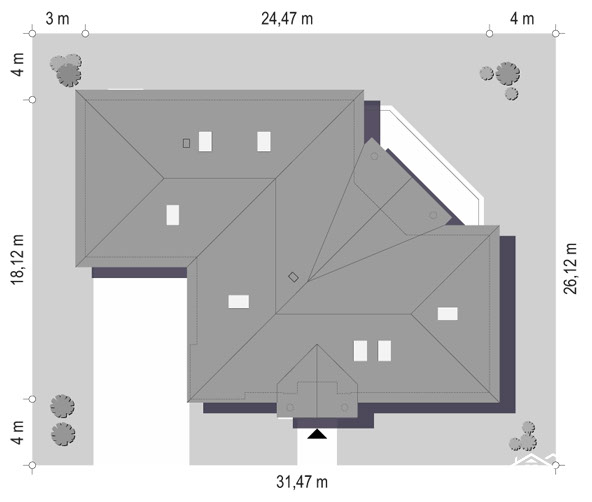 Projekt domu Willa Parkowa 6 jest kolejną wersją projektu z cieszącej się popularnością serii "Willi Parkowych". Dom nawiązuje stylistycznie do pozostałych "Wilii Parkowych", ale ma zdecydowanie inny, ciekawy rzut i układ funkcjonalny. Dom jest parterowy, z dodatkowym strychem-poddaszem, które może pozostać pustą przestrzenią nad parterem, ale też może pełnić rolę poddasza użytkowego. Bryłę zaprojektowano na planie litery "L" z dobudowaną częścią garażową. Dzięki takiemu kształtowi domostwo będzie pasowało zarówno na działkę z ogrodem z tyłu domu, jak i z ogrodem z boku. Projekt domu Willa Parkowa 6 może też być dobrą propozycją dla działki narożnej. Wewnętrzny dziedziniec od frontu przed garażami pozwoli domownikom na swobodne parkowanie autami na podjeździe, jak też na odseparowanie garażu od reprezentacyjnego wejścia do willi - zupełnie jak w amerykańskich rezydencjach. Wewnętrzne patio od strony ogrodu tworzy zamkniętą intymną przestrzeń tarasową z pięknym zadaszeniem nad tarasem i dwukondygnacyjnymi oknami łączącymi salon z ogrodem. Do budynku dostajemy się szerokimi drzwiami, z naświetlami bocznymi i górnymi do podwyższonego przedsionka z szatnią, skąd trafiamy do przestrzeni dziennej domu. Na środku domu stoi prostopadłościenna bryła ściany kominkowej ustawiona pod kątem, która oddziela hol od salonu. Na lewo od wejścia mamy piękną kuchnię z wykuszowym narożnym oknem z widokiem na wejście i dziedziniec wjazdowy. Kuchnia z wyspą i mini-jadalnią do codziennych posiłków. Z kuchni przedostajemy się – po amerykańsku – do części gospodarczej - z kotłownią i pralnią, oraz do garażu. W dwóch bocznych skrzydłach budynku mieszczą się pokoje mieszkańców - dwie sypialnie dziecięce z łazienką w jednym, oraz apartament rodziców z łazienką i garderobą, oraz gabinetem do pracy w drugim. Pośrodku domu, w centralnym miejscu mamy piękny wysoki salon a dużym oknem na taras i ogród. Na górnej kondygnacji zaprojektowano antresolę nad salonem, oraz dodatkową przestrzeń, w której bez problemu można urządzić dodatkowe trzy pokoje, albo wydzielić przestrzeń magazynową domu, czy przeznaczyć całe poddasze na rekreację - dowolnie. Projekt domu Willa Parkowa 6 to reprezentacyjna luksusowa podmiejska rezydencja, stylowej i ponadczasowej architekturze. Dom nie jest mały, ale jego wielkość nie jest przesadzona. Budynek jest energooszczędny i ma sensownie zaprojektowaną konstrukcję.