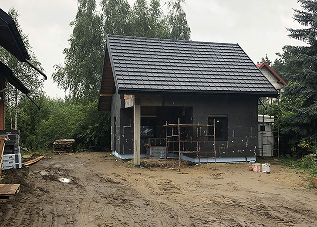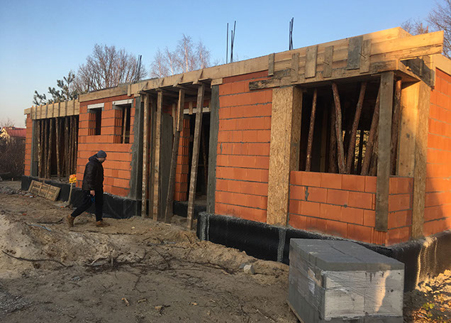 2. Projektowany budynek gospodarczy jest obiektem 1 kondygnacyjnym, niepodpiwniczonym. Budynek zaprojektowano w technologii tradycyjnej. Ściany murowane dwuwarstwowe, strop żelbetowy o gr. 16 cm, dach dwuspadowy o konstrukcji drewnianej, jętkowej. Kąt nachylenia połaci dachowych wynosi 40o.