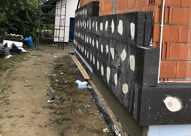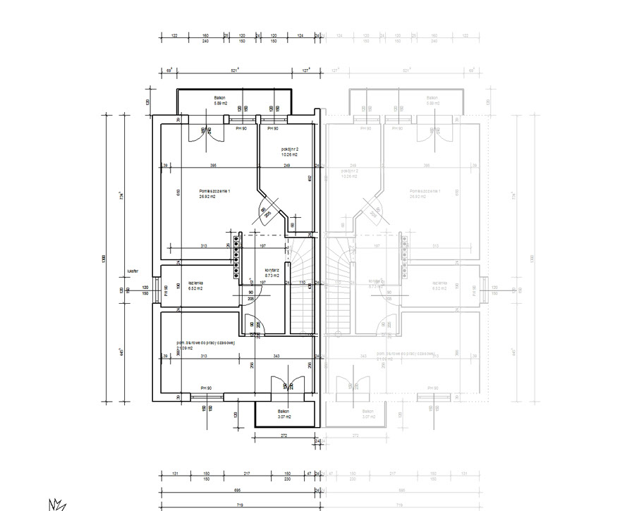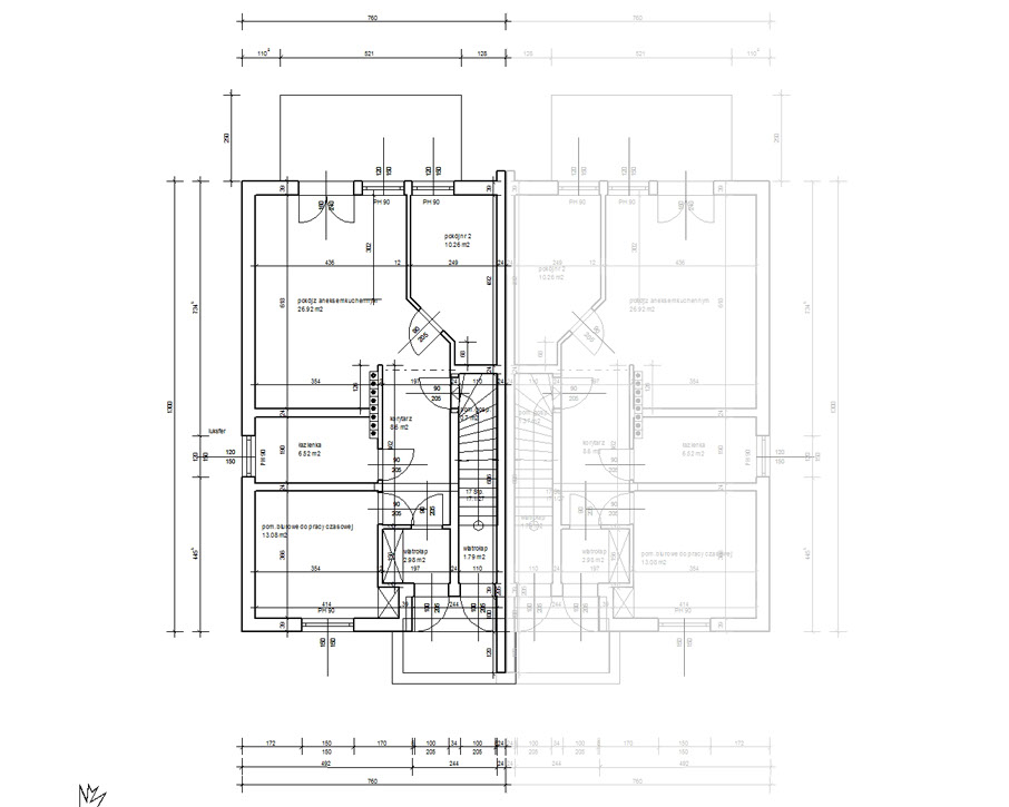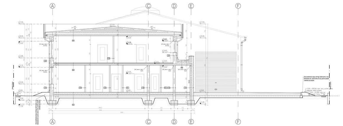 1. Projektowany budynek mieszkalny jest obiektem 2 kondygnacyjnym, podpiwniczonym. Budynek zaprojektowano w technologii tradycyjnej. Ściany murowane dwuwarstwowe, strop żelbetowy o gr. 18 cm, dach dwuspadowy o konstrukcji drewnianej, krokwiowo - płatwiowej i jętkowej nad garażem. Kąt nachylenia połaci dachowych wynosi 38o.