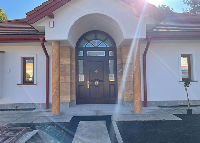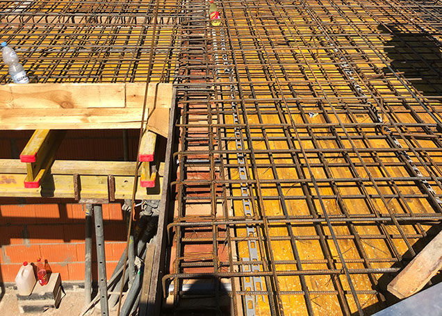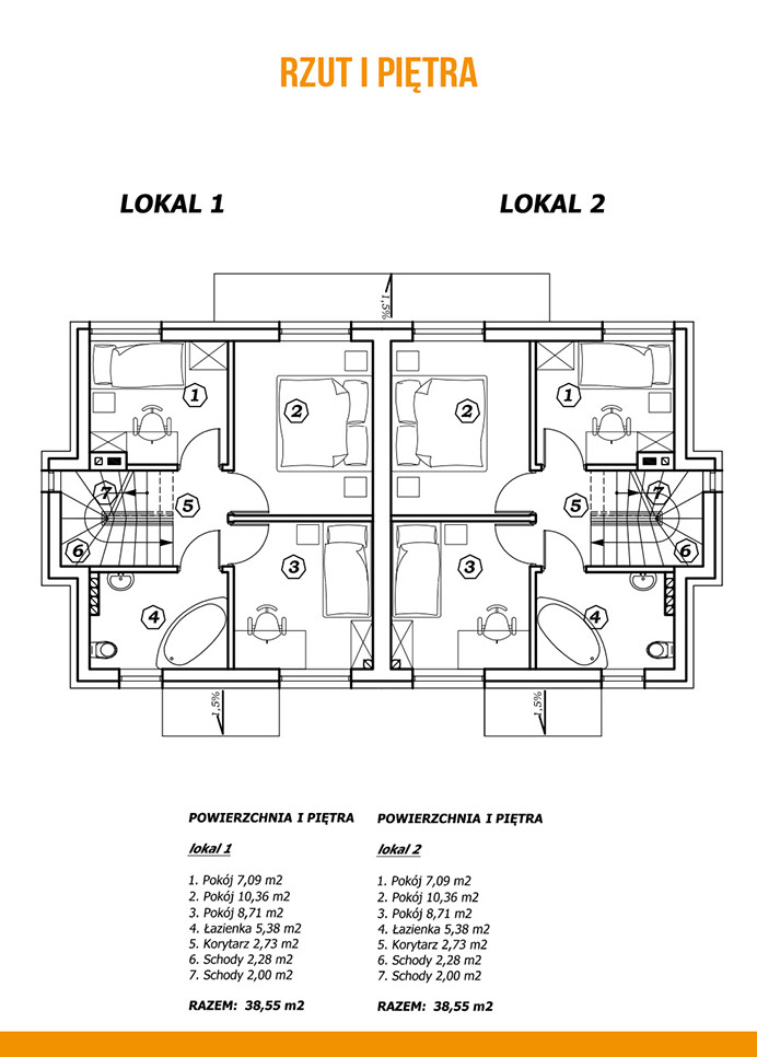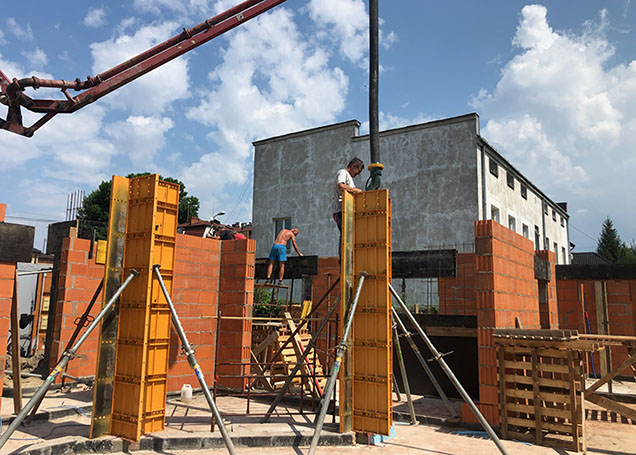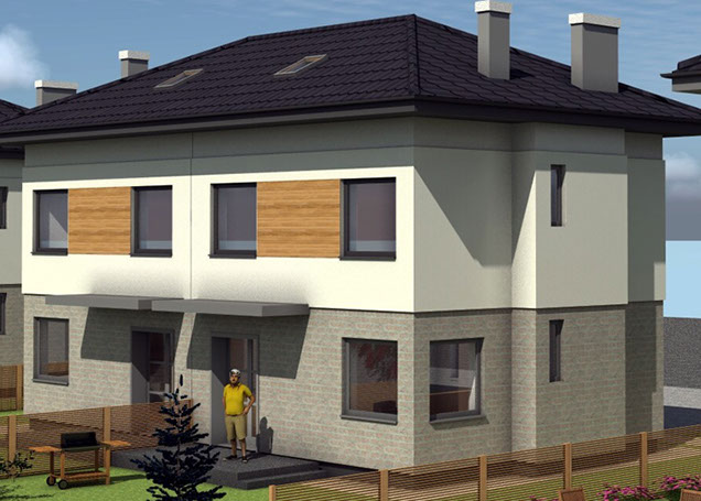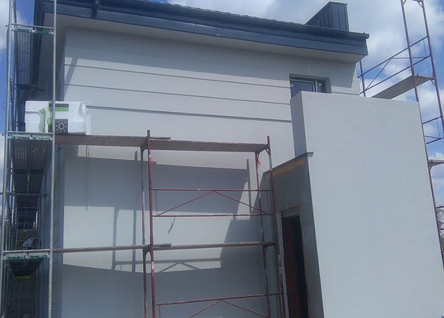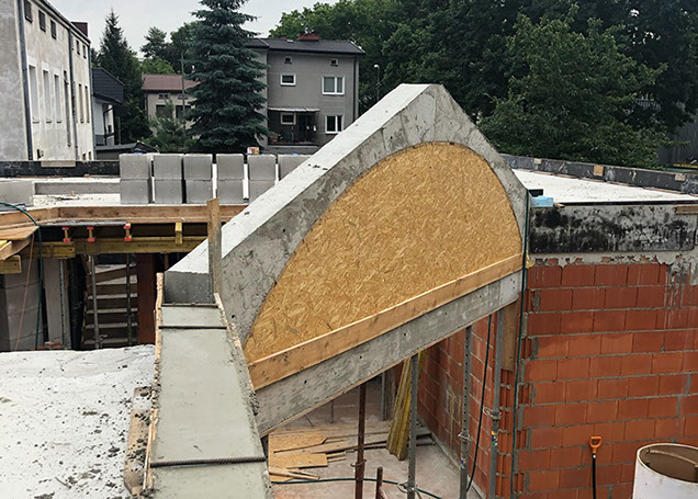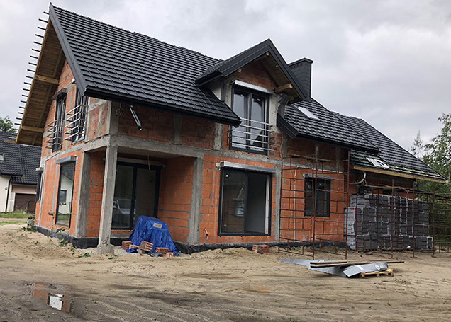 1. Projektowany budynek mieszkalny jest obiektem 2 kondygnacyjnym, podpiwniczonym. Budynek zaprojektowano w technologii tradycyjnej. Ściany murowane dwuwarstwowe, strop żelbetowy o gr. 18 cm, dach dwuspadowy o konstrukcji drewnianej, krokwiowo - płatwiowej i jętkowej nad garażem. Kąt nachylenia połaci dachowych wynosi 38o.